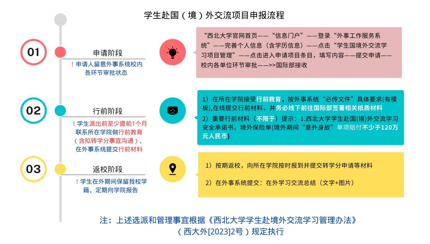 3.申请学生在确定录取后,应及时履行出国(境)前相关行前手续。请务必了解有关本项目学生的申请、行前、返校阶段情况说明,请见下图说明。