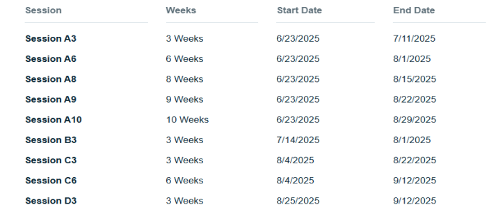 不同时间段的暑期课程申请及注册截止时间不同,Session A与Session B为5月1日,Session C和Session D为6月1日,详见以下两个链接: