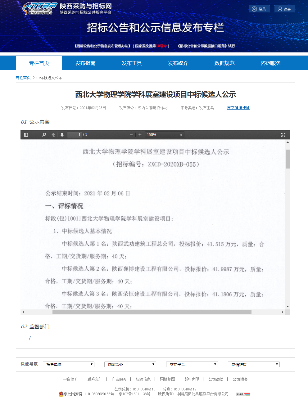 欧冠官方网站物理学院学科展室建设项目中标候选人公示 作者: 编辑:郭平 时间:2021-02-03 http://bulletin.sntba.com/candidateBulletin/2021-02-03/269328.html