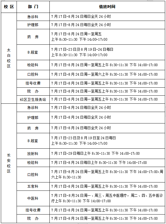 2023年校医院暑假期间医疗工作安排 作者: 编辑: 时间:2023-07-17 全体师生员工及社区居民: 根据学校《关于2023年暑假安排的通知》,为持续做好校内医疗保障,结合医院实际情况,现将暑假期间(7月17日至8月24日)校医院医疗工作安排通知如下: 一、医院值班安排 二、医院值班电话 太白校区: 029-88303120(急诊科) 029-88302922(办公室) 长安校区: 029-88309120(急诊科) 029-88308200(办公室) 欧冠官方网站医院 2023年7月17日