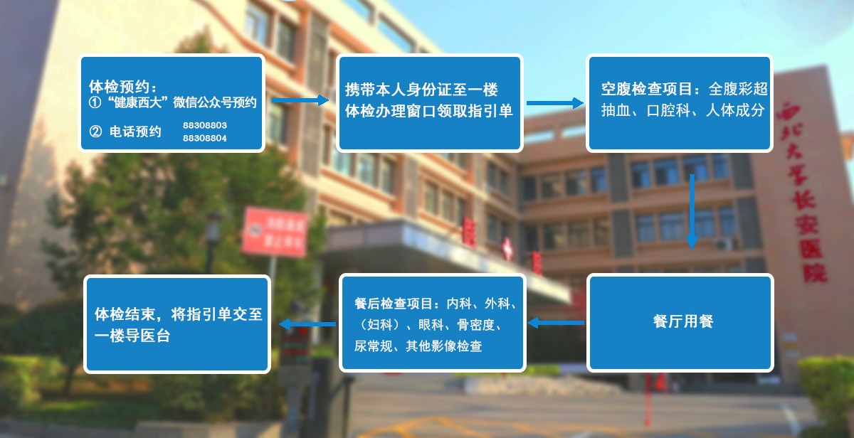 6.自费体检:各单位如需为聘用人员提供体检,可采取单位集体统一报送人员信息并结算费用、个人自行预约的方式参加体检;个人自费体检者,建议提前前往长安校区校医院二楼预约室现场选择套餐,预约缴费后按时参加体检。