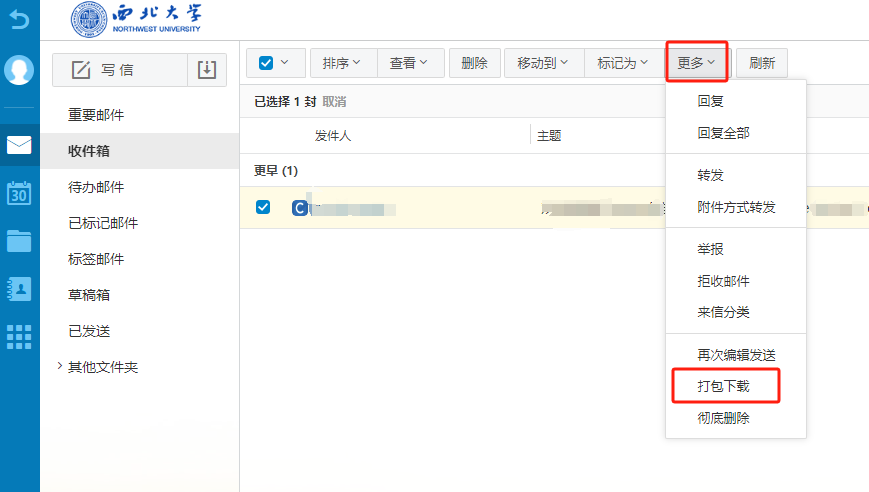 登录邮箱后,依次点击“收件箱”->“所有”->“更多”->“打包下载”。