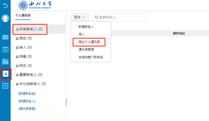 登录现有邮箱,依次点击“通讯录”->“个人通讯录”->“全选所有联系人”->“导出个人通讯录”。