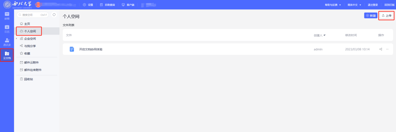 登录新版邮箱后,依次点击“云文档”->“个人空间”->“上传”->选择下载的网盘文件,点击“确定”。