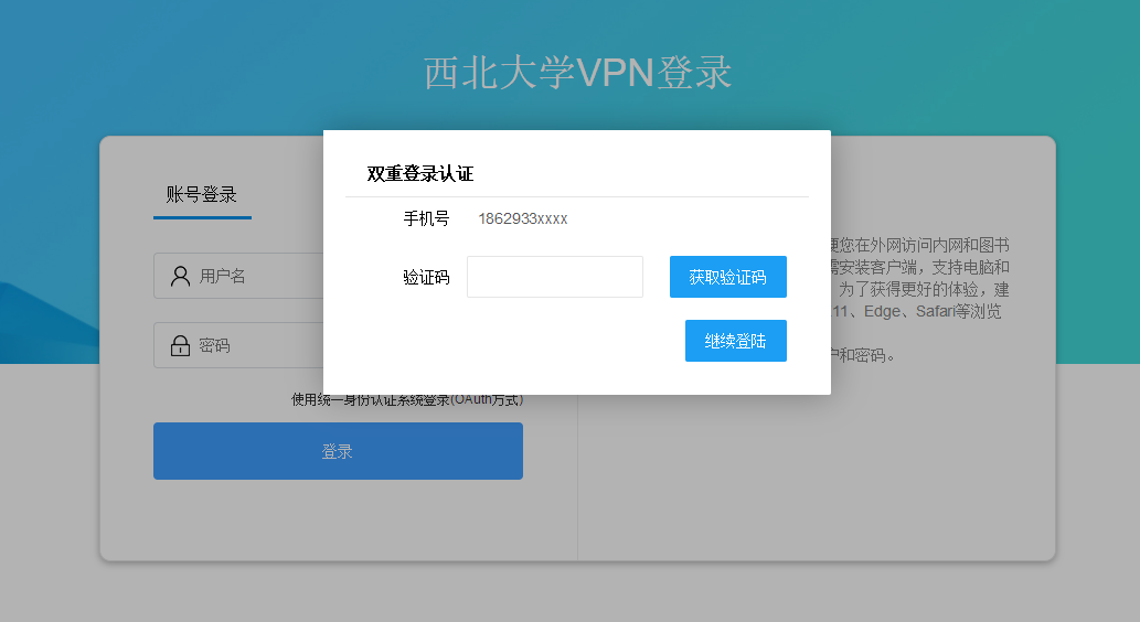 新版WEBVPN采用双重认证方式,在通过统一身份认证后,需要通过短信验证码进行二次验证。请提前在统一身份认证中完善手机号信息。