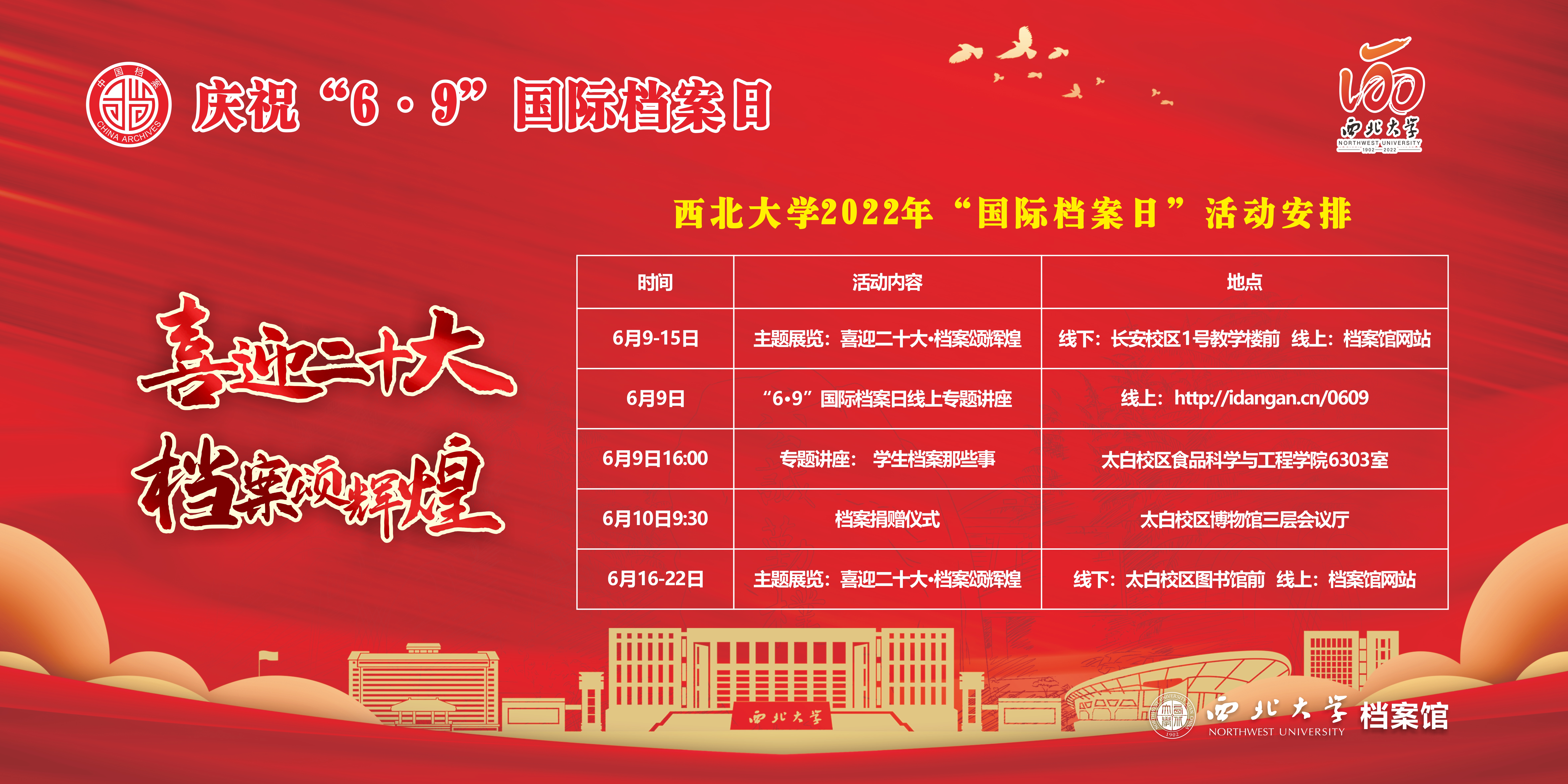 欧冠官方网站2022年国际档案日活动安排 作者: 编辑:孙可佳 时间:2022-06-09 为庆祝中国共产党第二十次全国代表大会召开和欧冠官方网站建校120周年,宣传贯彻落实新修订的《中华人民共和国档案法》,不断增强全校师生档案意识,助力学校“双一流”建设,积极发挥档案工作“记载历史、传承文明、服务未来”的作用和档案“存凭、留史、资政、育人”的功能,讲好西大故事。在“6· 9”国际档案日和欧冠官方网站120周年校庆活动来临之际,学校举办主题为“喜迎二十大•档案颂辉煌”的国际档案日系列宣传活动。 具体活动安排如下,欢迎广大师生踊跃参加!