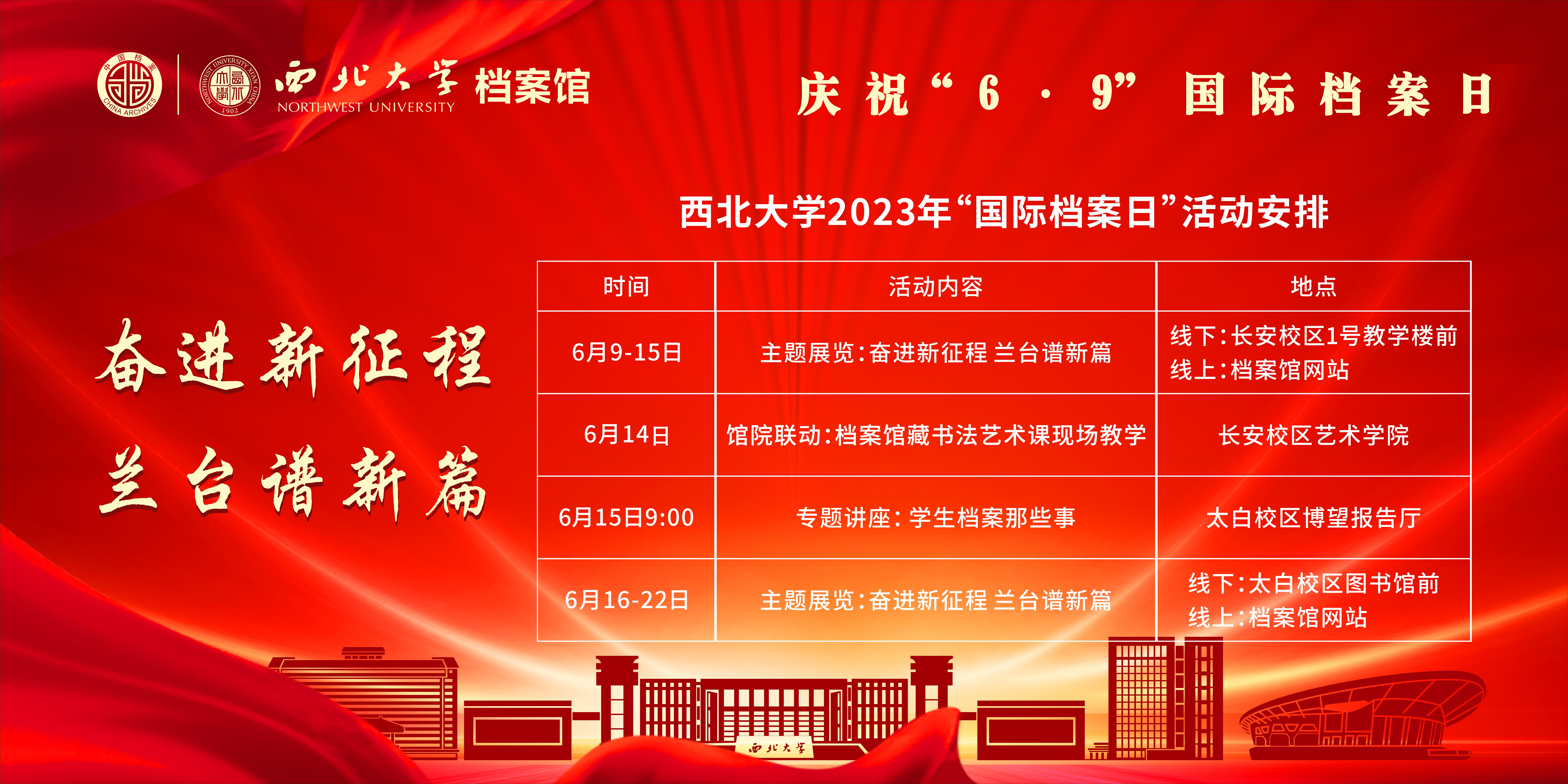 为深入学习贯彻习近平新时代中国特色社会主义思想主题教育,全面贯彻落实党的二十大精神,认真贯彻《关于加强和改进新形势下档案工作的意见》和《国家档案局关于开展2023年国际档案日系列宣传活动的通知》等有关精神,发挥档案工作“记载历史、传承文明、服务未来”的作用和档案“存凭、留史、资政、育人”的功能,讲好“西大故事”,增强全校师生档案意识,进一步推动学校档案工作,助力“双一流”建设,学校举办第九届以“奋进新征程 兰台谱新篇”为主题的“国际档案日”系列活动。具体活动安排如下,欢迎广大师生参加!