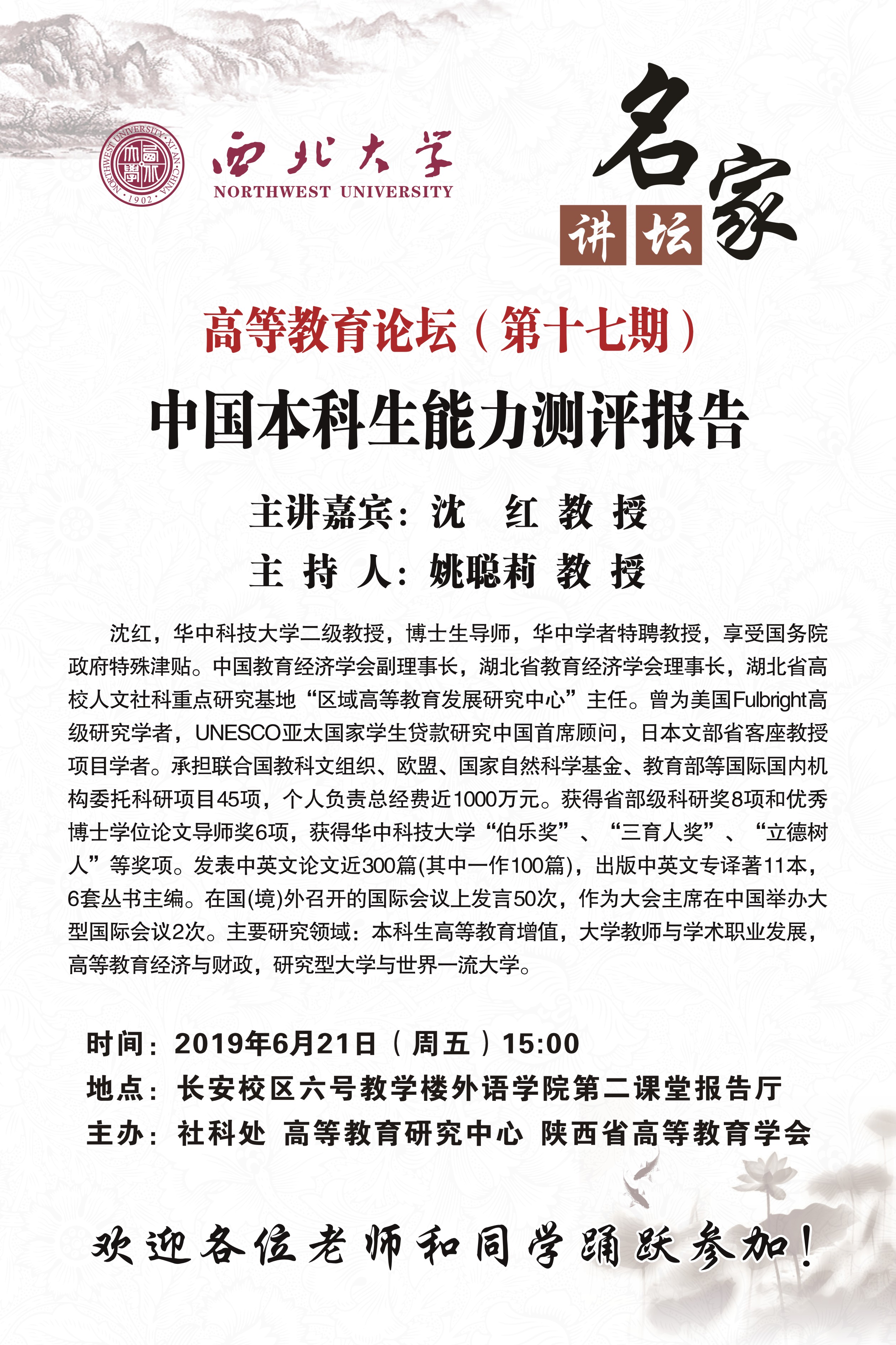 关于举办"名家讲坛"暨"高等教育论坛"(第十七期)的通知 作者: 编辑: 时间:2019-06-19 10:43 校内各有关单位:欧冠官方网站名家讲坛暨高等教育论坛(第十七期)即将举行,现将具体情况通知如下:讲座题目:中国本科生能力测评报告主讲嘉宾:沈 红 教授讲座时间:6月21日(周五)15:00讲座地点:长安校区六号教学楼外语学院第二课堂报告厅主办单位:社科处、高等教育研究中心、陕西省高等教育学会欢迎各位老师和同学踊跃参加!
