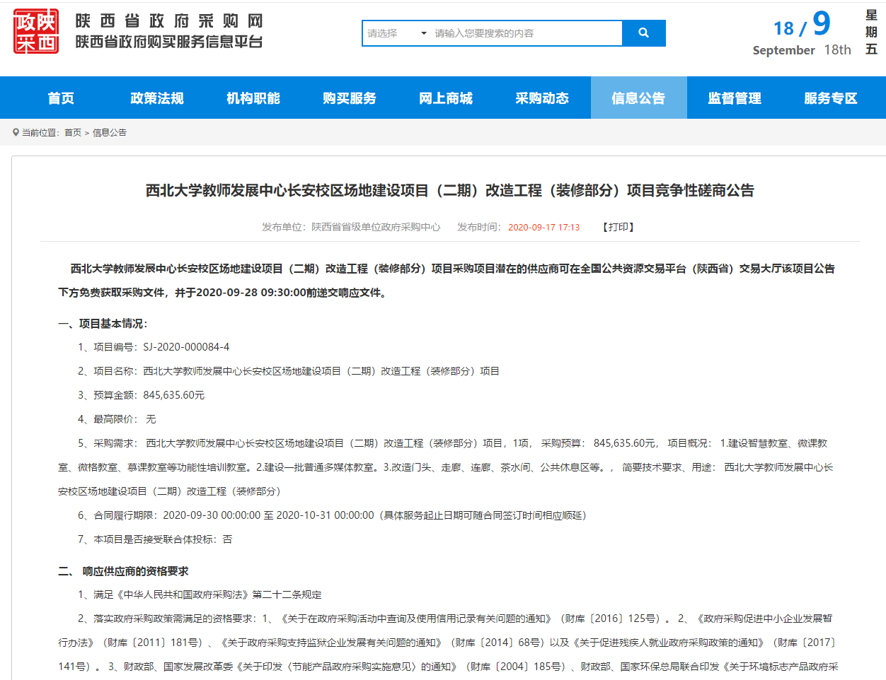 欧冠官方网站教师发展中心长安校区场地建设项目(二期)改造工程(装修部分)项目竞争性磋商公告 作者: 编辑:季兴帅 时间:2020-09-18 公告原文链接:http://www.ccgp-shaanxi.gov.cn/notice/noticeDetail.do?noticeguid=8a85be327394d739017499e718111004