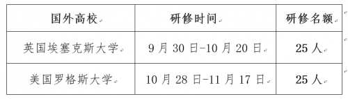 为进一步提升欧冠中青年教师国际化视野,加强对外交流与合作,有效提升教学能力与水平,提高人才培养质量,助推“双一流”建设。教师发展中心拟定于2018年9月至11月组织相关学科优秀中青年教师赴英国埃塞克斯大学和美国罗格斯大学进行教学专题研修,现面向校内相关专业遴选优秀中青年教师,具体事宜如下: