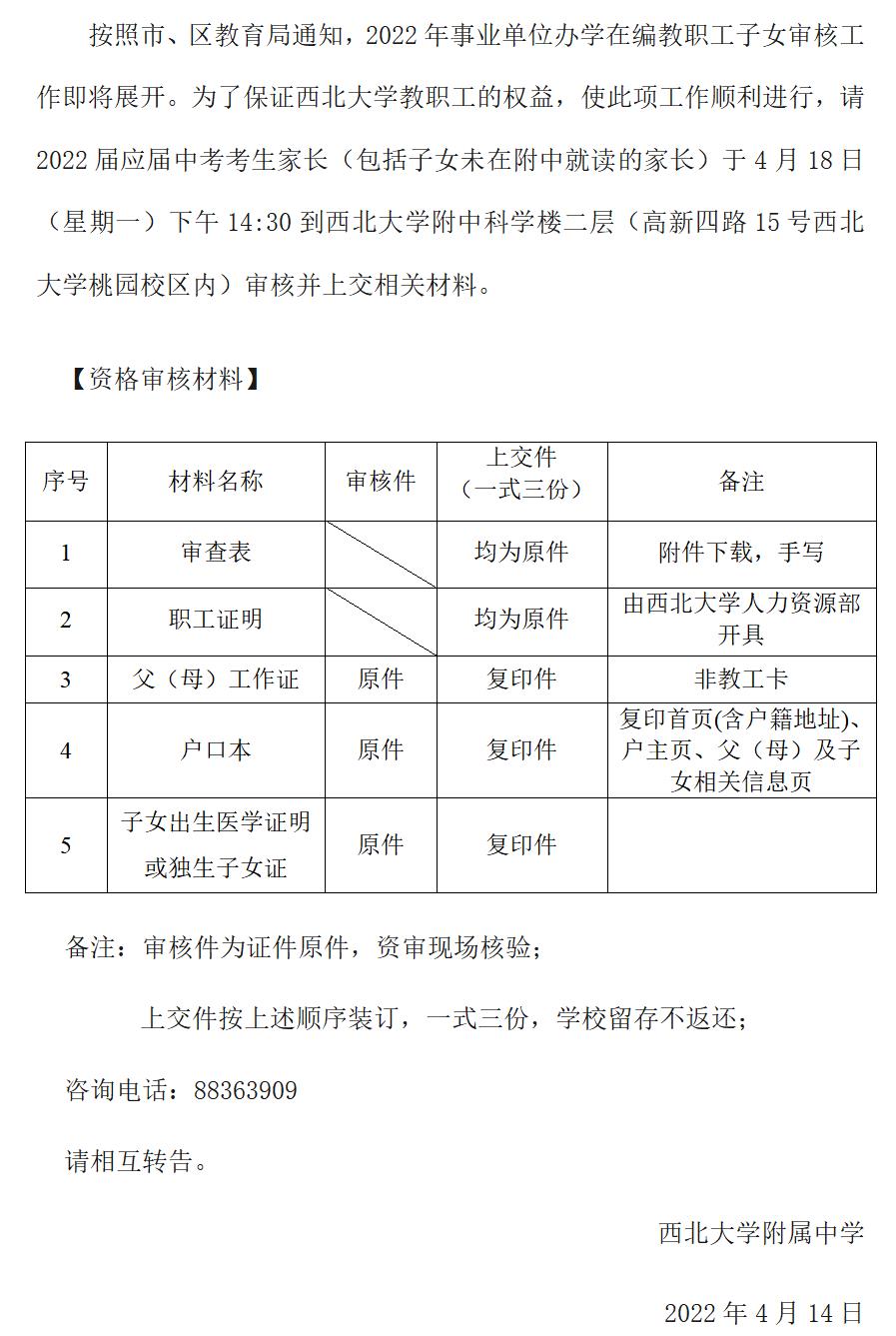 关于确认2022届中考欧冠官方网站教职工子女身份的通知