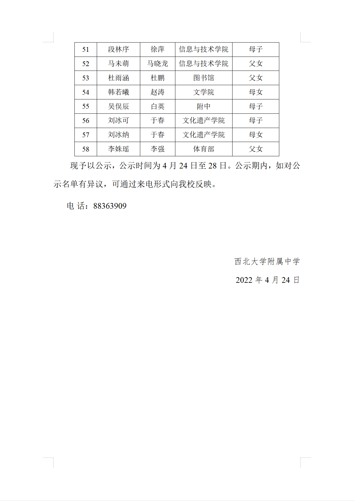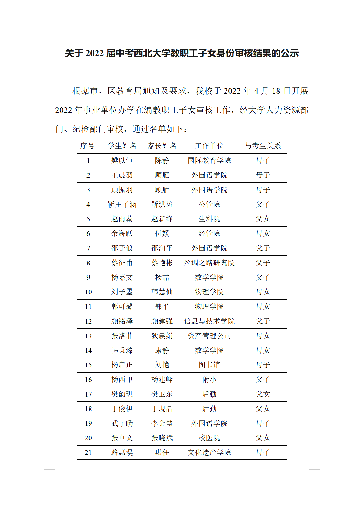 关于2022届中考欧冠官方网站教职工子女身份审核结果的公示