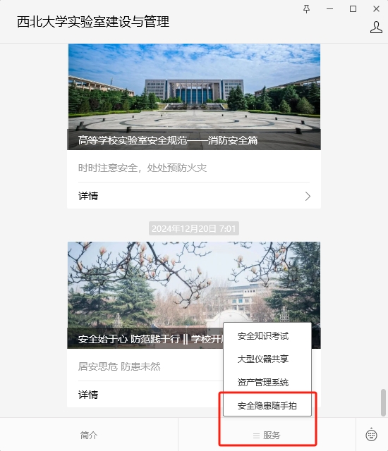 (1)关注“欧冠官方网站实验室建设与管理”微信公众号,选择“服务”—“安全隐患随手拍”,填写个人信息、隐患描述等,并上传隐患照片。