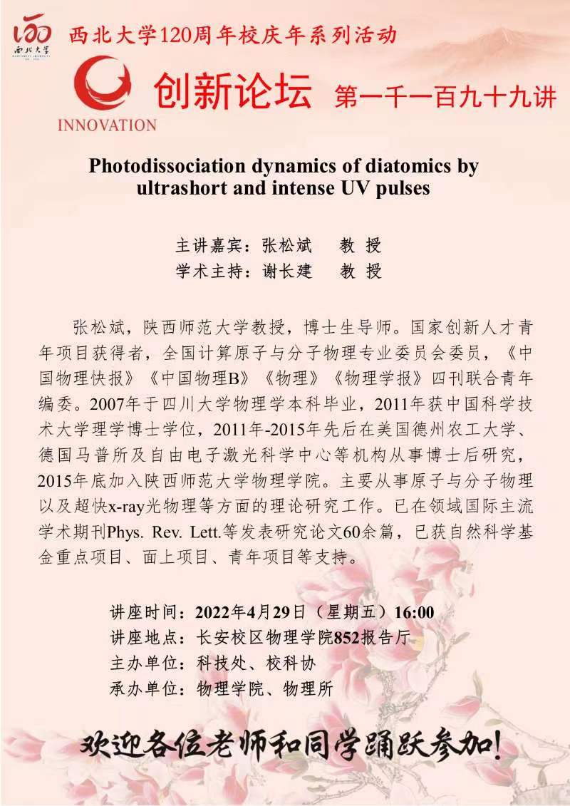 欧冠官方网站创新论坛第一千一百九十九讲暨120周年校庆年系列活动:Photodissociation dynamics of diatomics by ultrashort and intense UV pulses 作者:张松斌 教授 编辑:杨钊 时间:2022-04-26