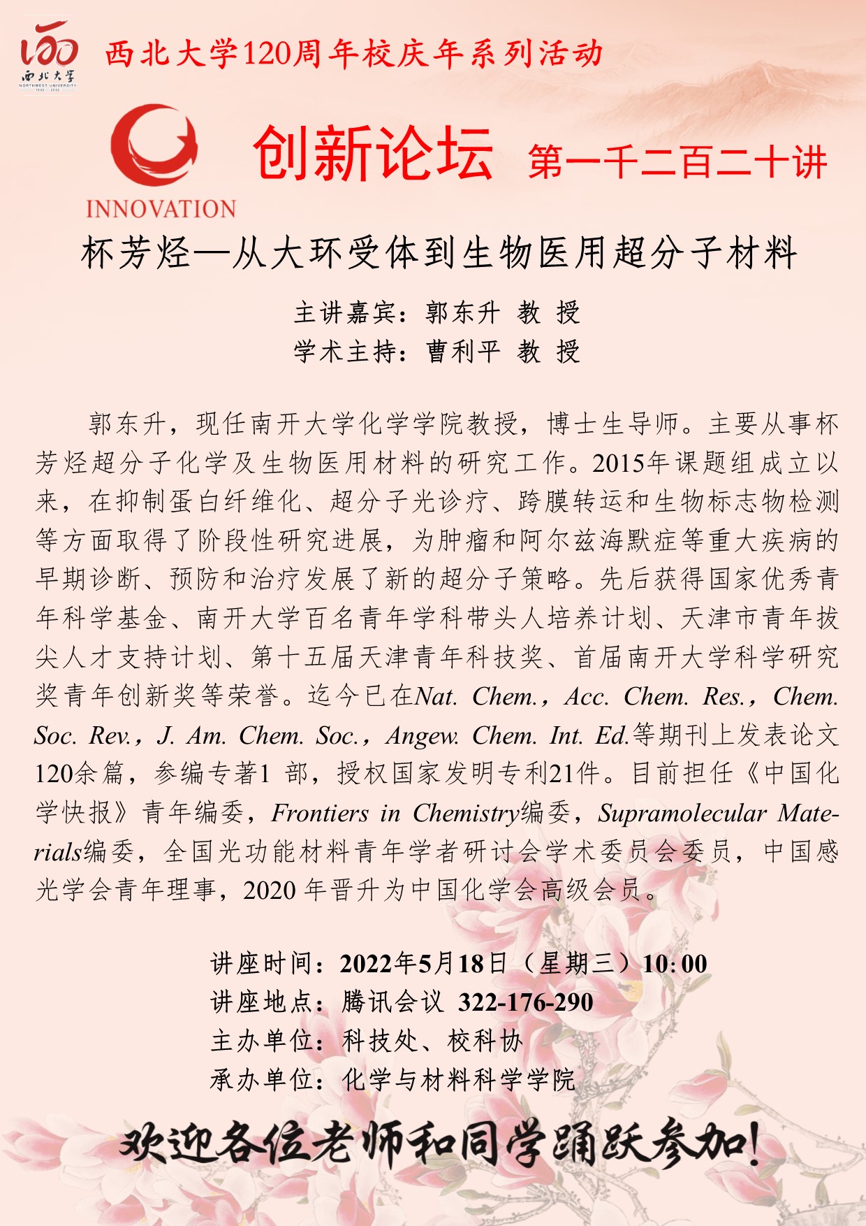 欧冠官方网站创新论坛第一千二百二十讲暨120周年校庆年系列活动:杯芳烃—从大环受体到生物医用超分子材料