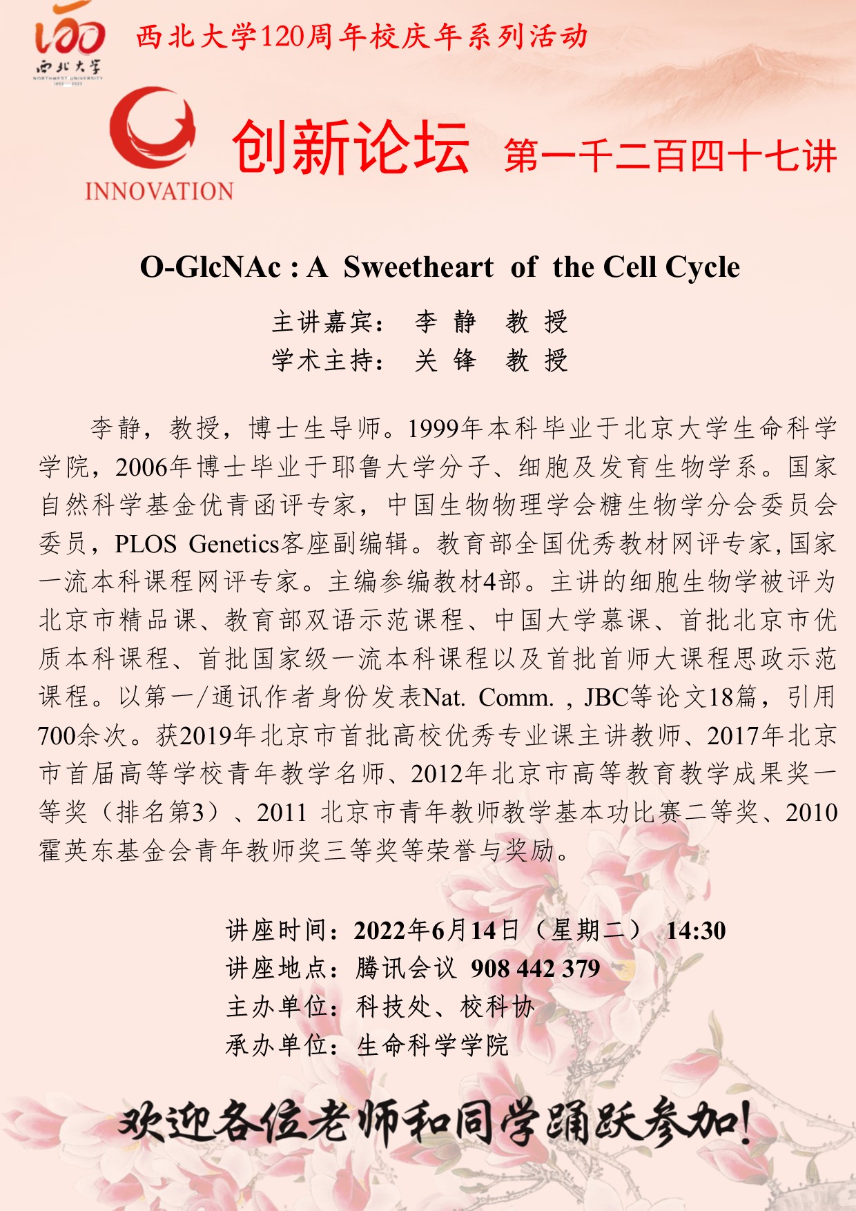 欧冠官方网站创新论坛第一千二百四十七讲暨120周年校庆年系列活动:O-GlcNAc : A Sweetheart of the Cell Cycle 作者:李 静 教 授 编辑: 时间:2022-06-13