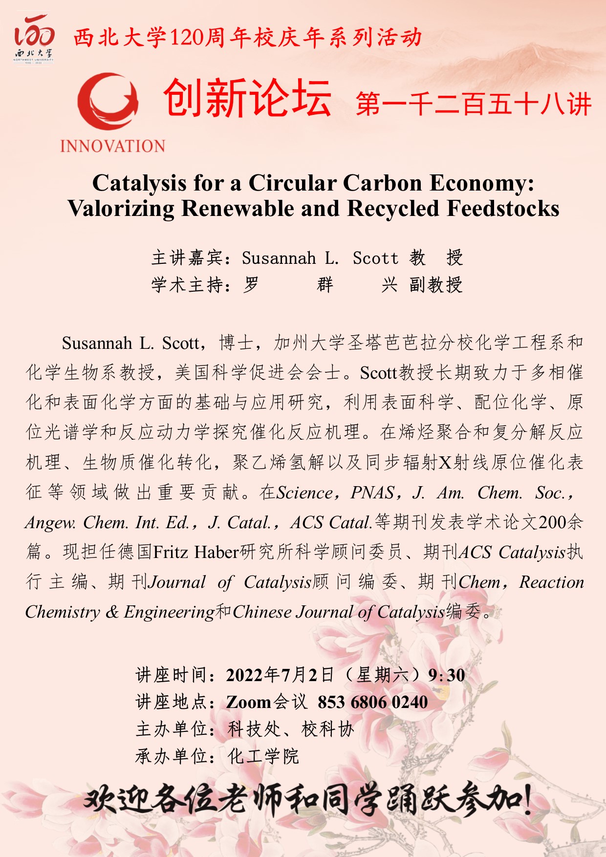欧冠官方网站创新论坛第一千二百五十八讲暨120周年校庆年系列活动:Catalysis for a Circular Carbon Economy: Valorizing Renewable and Recycled Feedstocks 作者:Susannah L. Scott 教授 编辑: 时间:2022-06-30