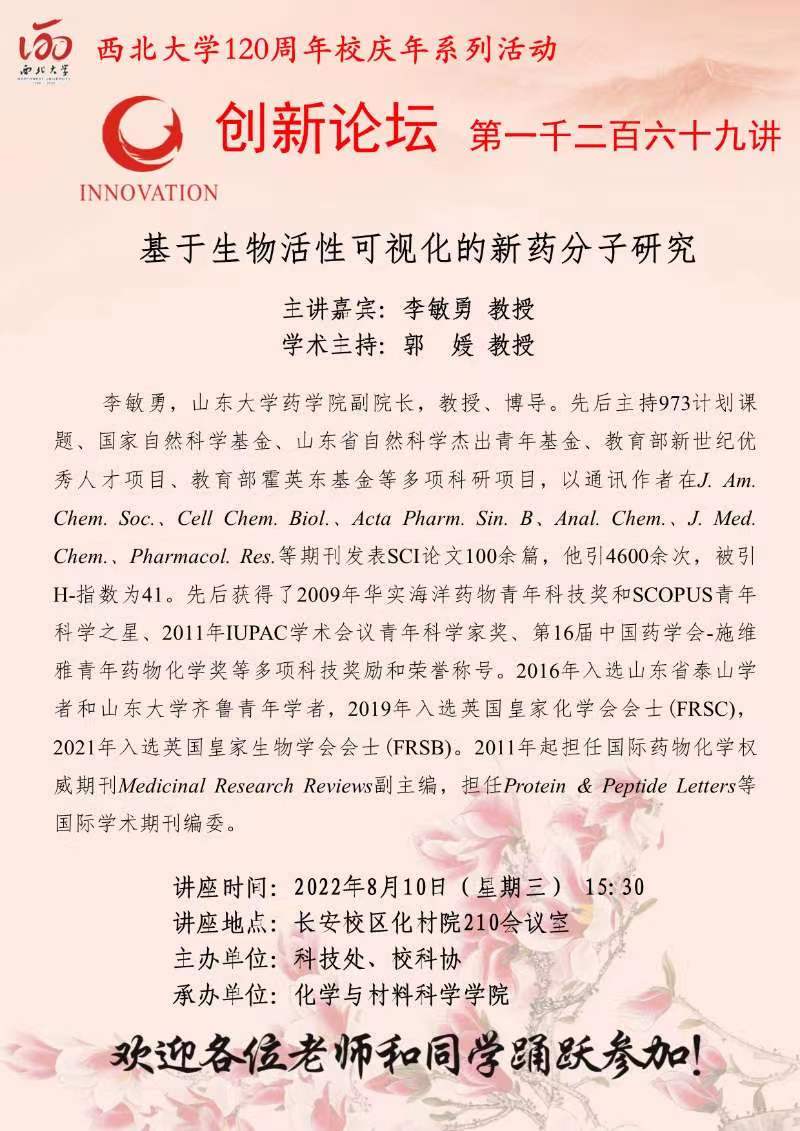 欧冠官方网站创新论坛第一千二百六十九讲暨120周年校庆年系列活动:基于生物活性可视化的新药分子研究