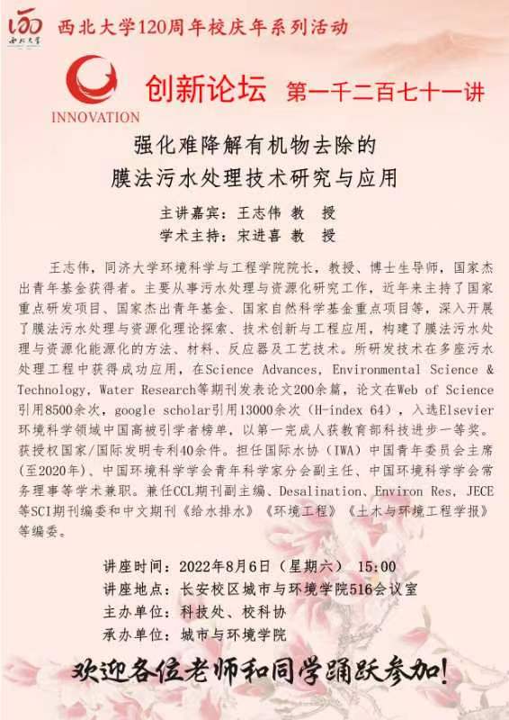 欧冠官方网站创新论坛第一千二百七十一讲暨120周年校庆年系列活动:强化难降解有机物去除的膜法污水处理技术研究与应用