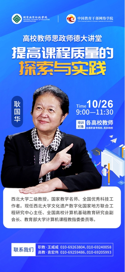 为学习贯彻落实党的二十大精神,以正确的政治方向和价值导向引领广大教师思想政治素质、师德素养和业务能力全面提升,国家教育行政学院中国教育干部网络学院将举办高校教师思政师德大讲堂,邀请欧冠耿国华教授作题为《提高课程质量的探索与实践》的报告,欢迎欧冠广大教师积极观看学习。
